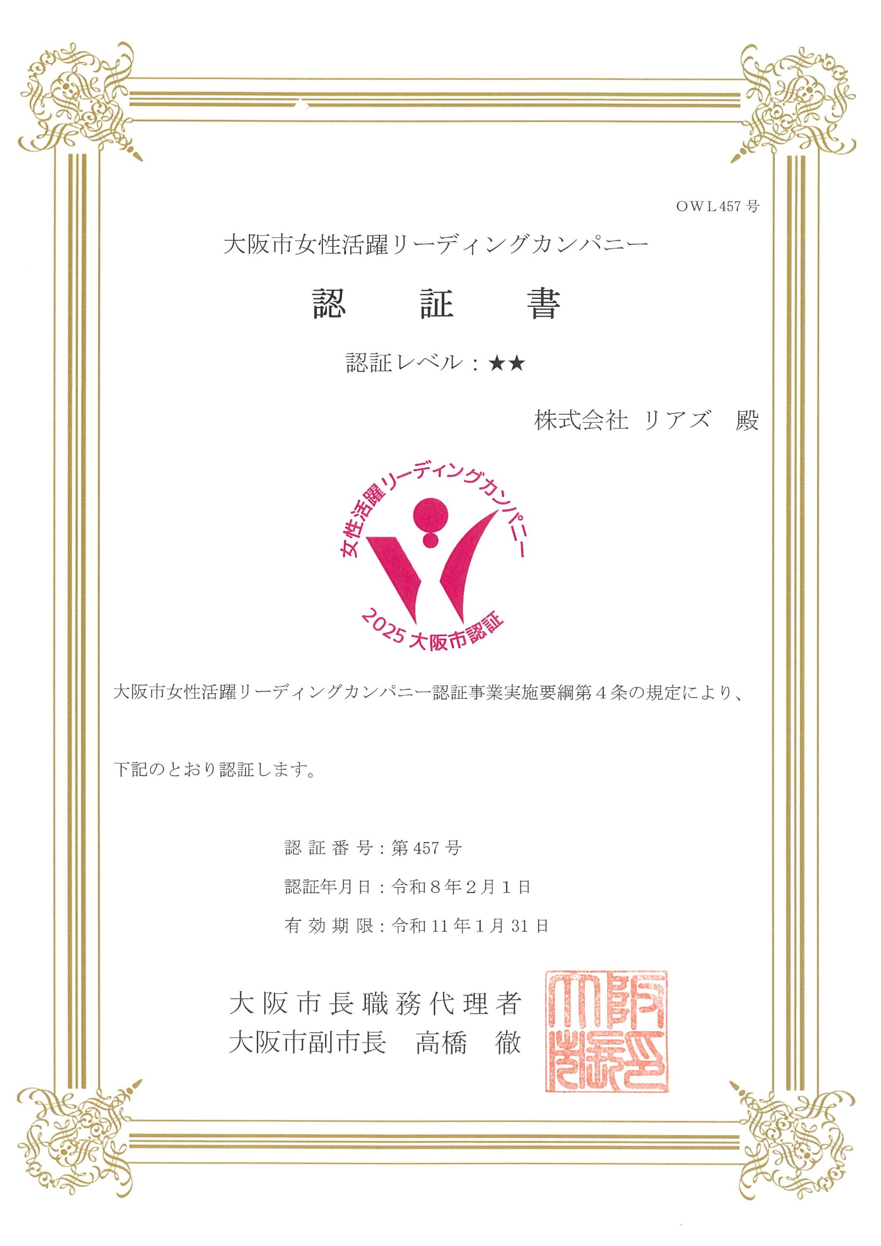 大阪市が実施する「女性活躍リーディングカンパニー」認証は、女性にとって働きやすい職場環境づくりに積極的に取り組む企業等を、一定の基準に基づき認証する制度です。 当社は、女性が安心して能力を発揮できる職場環境の整備が評価され、2020年2月1日付で本認証を取得しております。